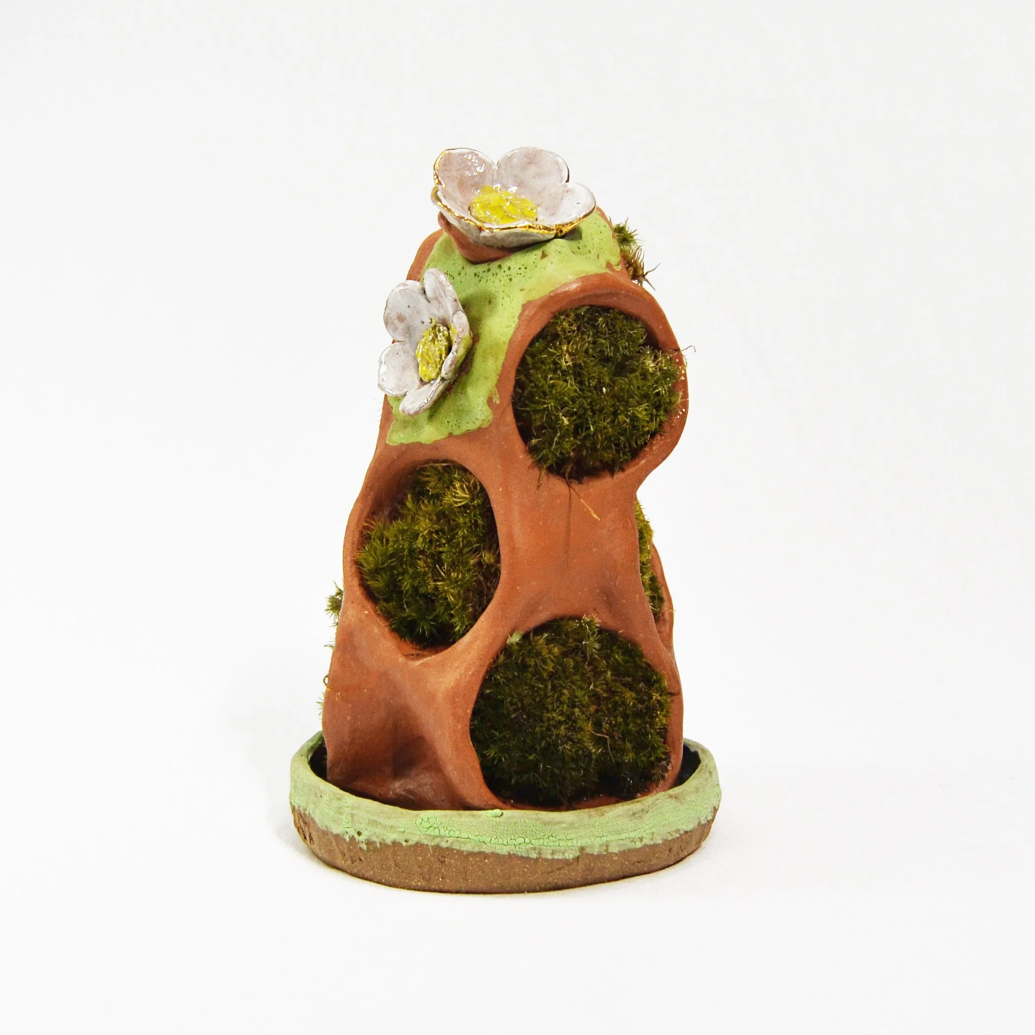 Micaceous clay, glaze, gold luster, beeswax, moss